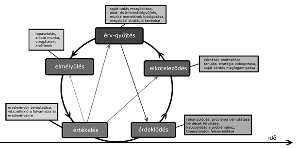 Az öt állomás egymást követve, de minden állomáson az értékeléssel és az érdeklődés fenntartásával szorosan összefonódva alkotja a tanulási ciklust. Az ötödik, “értékelő” állomás végül újabb ciklus kezdetéhez vezet: ez a felmerült újabb kérdések, problémák, eredmények, tanulási igények alapján szerveződik.