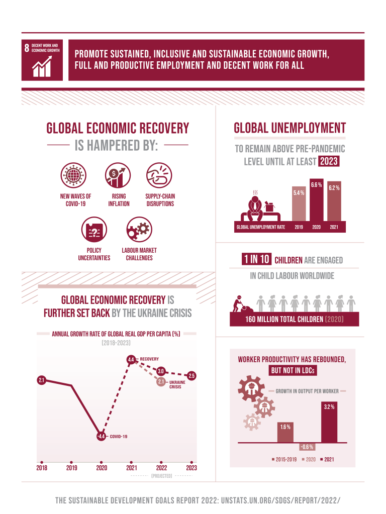 A globális munkanélküliség legalább 2023-ig a világjárvány előtti szinten marad: a globális munkanélküliségi ráta 2019-ben 5,4% volt, míg 2020-ban 6,6%, 2021-ben 6,2%.